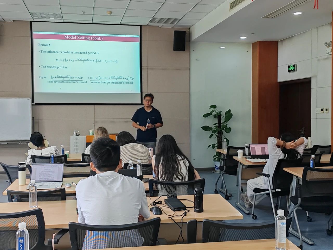 接下来,吴教授结合两阶段模型和成本递增函数,分段向大家讲解了各阶段主体的决策和利润效应。第一阶段中,网红自身产生了一定的利润,商品通过其他销售渠道和网红效应叠加,得到了一个总的品牌利润。第二阶段中,结合巴斯扩散模型(Bass Dissemination model,也叫同伴营销效应或口碑销售效应),吴教授讲解了h值的概念,它代表了产品的宣传推广度。随着销售额增加,主播红利也会增加;商品方面的利润不仅随着网红代理的销售额增加,同时其他销售量也会因为人群扩散效应而增加,从而双管齐下增加商品自身的销售利润。